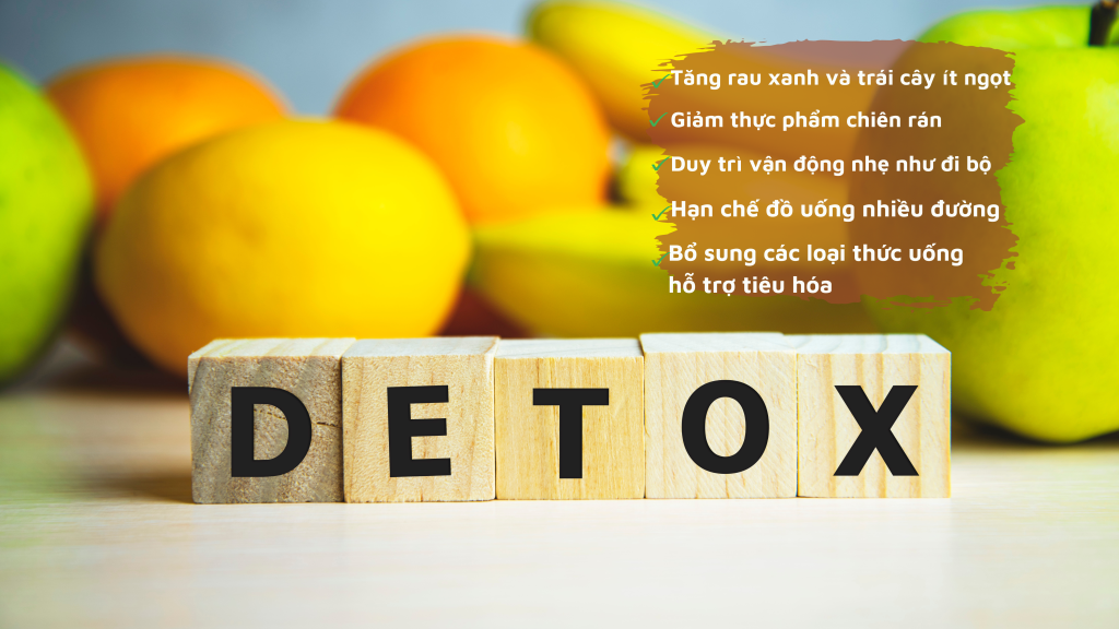 Uống đủ nước mỗi ngày để hỗ trợ chuyển hóa; tăng rau xanh và trái cây ít ngọt nhằm bổ sung chất xơ; giảm thực phẩm chiên rán; duy trì vận động nhẹ như đi bộ; ngủ đúng giờ để ổn định đồng hồ sinh học; hạn chế đồ uống nhiều đường; và bổ sung các loại thức uống hỗ trợ tiêu hóa. Trong đó, trà gừng được xem như một “detox tự nhiên” nhờ đặc tính làm ấm cơ thể và giúp giảm cảm giác đầy hơi sau khi ăn nhiều thực phẩm dầu mỡ.