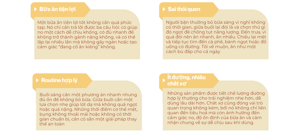 Đối với người bận, sự tiện lợi thực chất là một nhu cầu chính đáng. Không phải ai cũng có thời gian nấu bữa sáng mỗi ngày. Vì thế, cách tiếp cận hợp lý hơn là luôn có sẵn những lựa chọn đủ nhanh, đủ gọn để không phải bỏ bữa hoặc chọn đại.