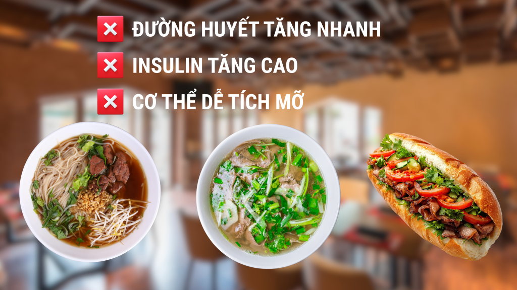 Bún và phở được làm từ gạo trắng đã xay xát kỹ, loại bỏ phần lớn chất xơ và vi chất. Khi ăn, đường huyết tăng nhanh, insulin tăng cao và cơ thể dễ tích trữ mỡ nếu dư năng lượng. Bánh mì trắng cũng tương tự, tạo cảm giác no nhanh nhưng đói trở lại chỉ sau vài giờ.